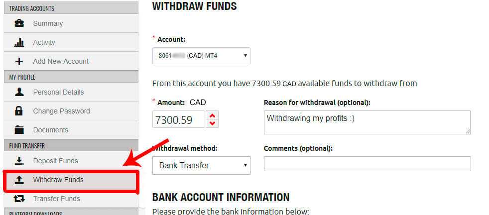 As you can see from the screenshot below, I decided to use the 'withdraw funds' function to withdraw $7,300.59 from my account.